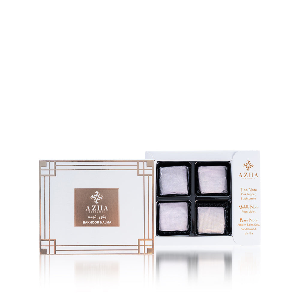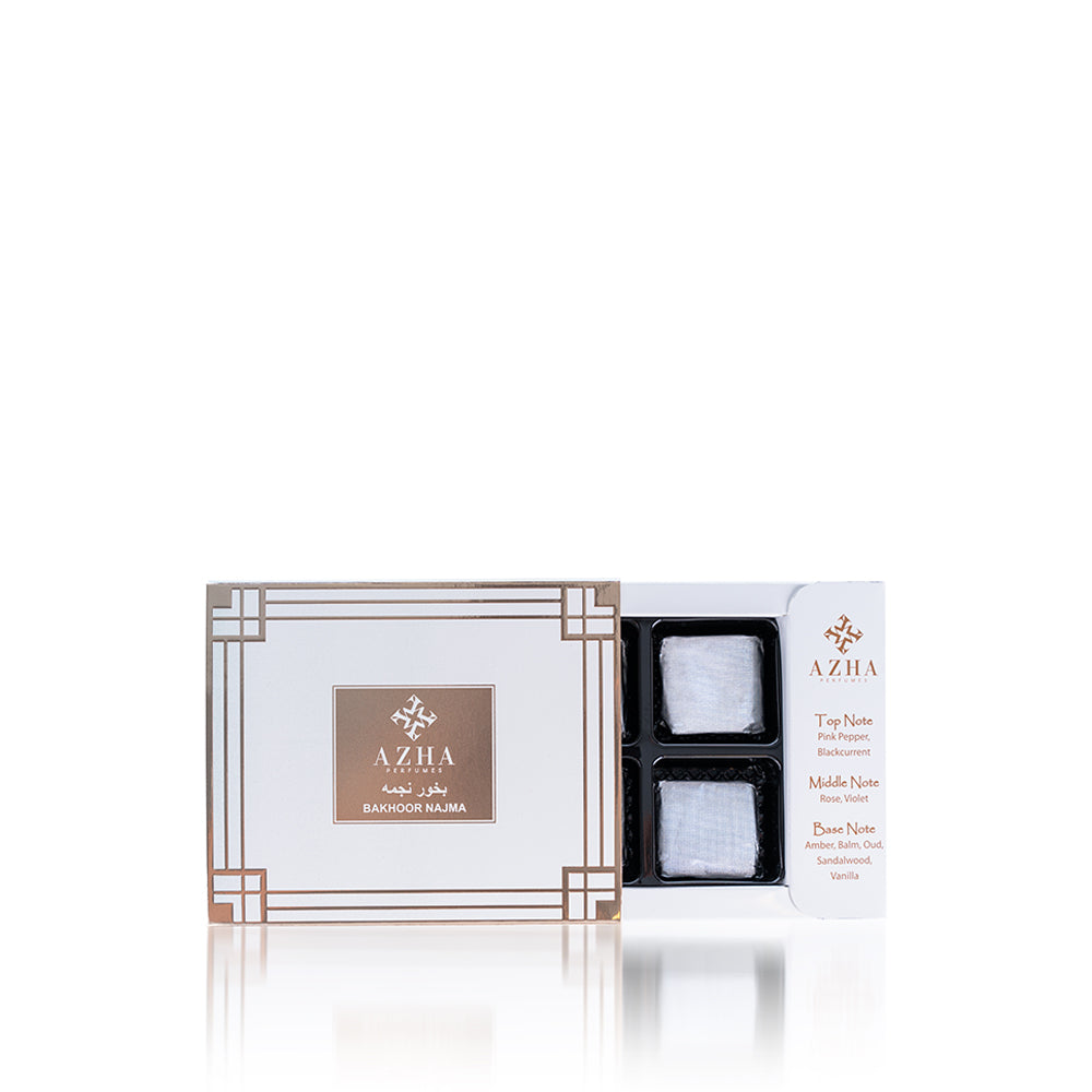 دلل حواسك في مستوى أعلى من السحر مع بخور نجمة. رحلة سماوية مكثفة في قرص عطري. يستهل رحلته بنفحات منعشة من الفلفل الوردي والكشمش الأسود، لتمهد الطريق لقلب يتكشّف عن مزيج متناغم من الورد والبنفسج، تتداخل أخيرا مع فخامة توليفة استثنائية من العود، العنبر، البلسم، وخشب الصندل والفانيليا. بخور نجمة عالم دافئ وساحر من الجمال والأناقة الخالدة.