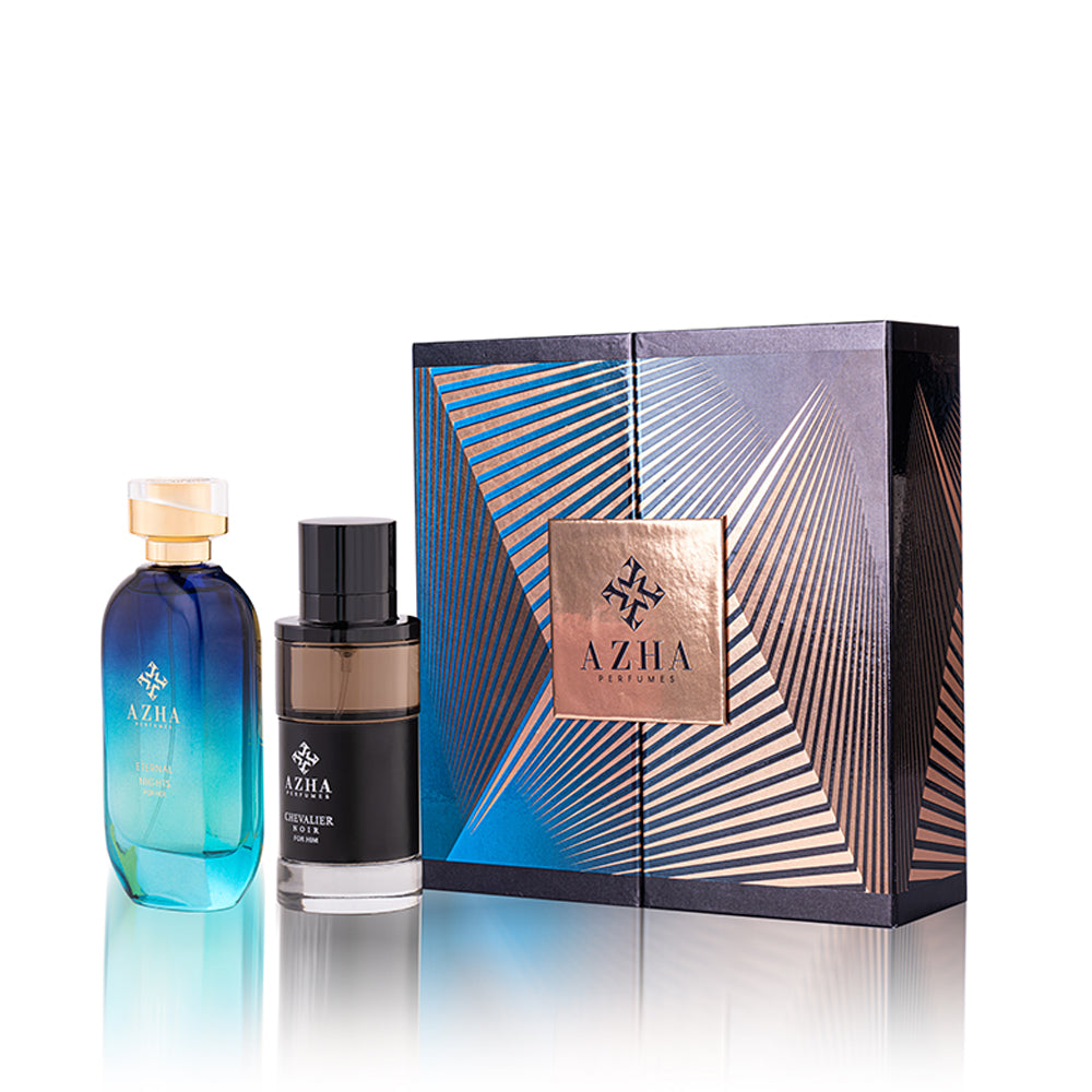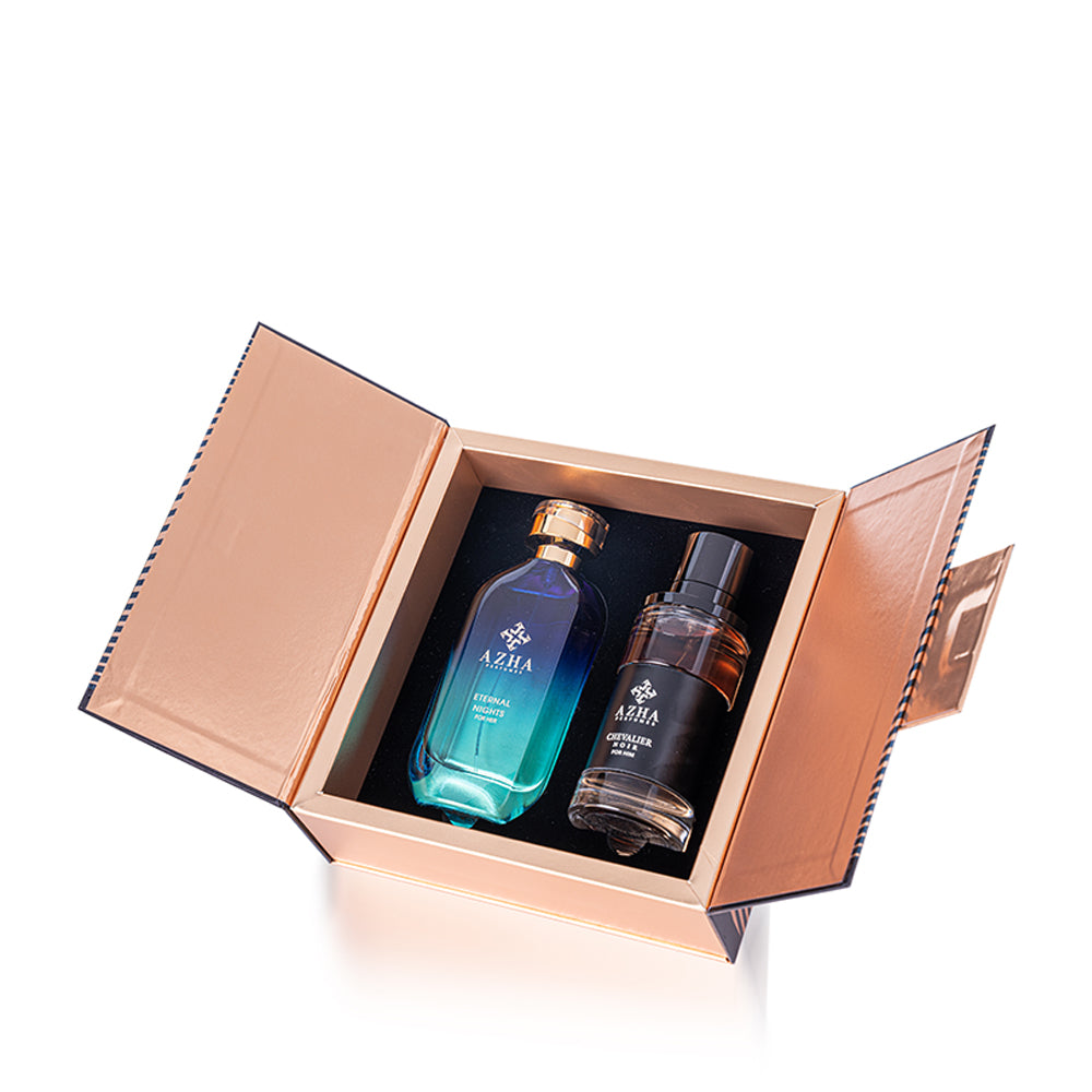 This exclusive gift set brings together two captivating fragrances: Chevalier Noir, a bold and refined scent for men, and Eternal Nights, a deep, alluring fragrance for women. Perfectly balanced, this set is ideal for those who appreciate timeless elegance and sophistication.