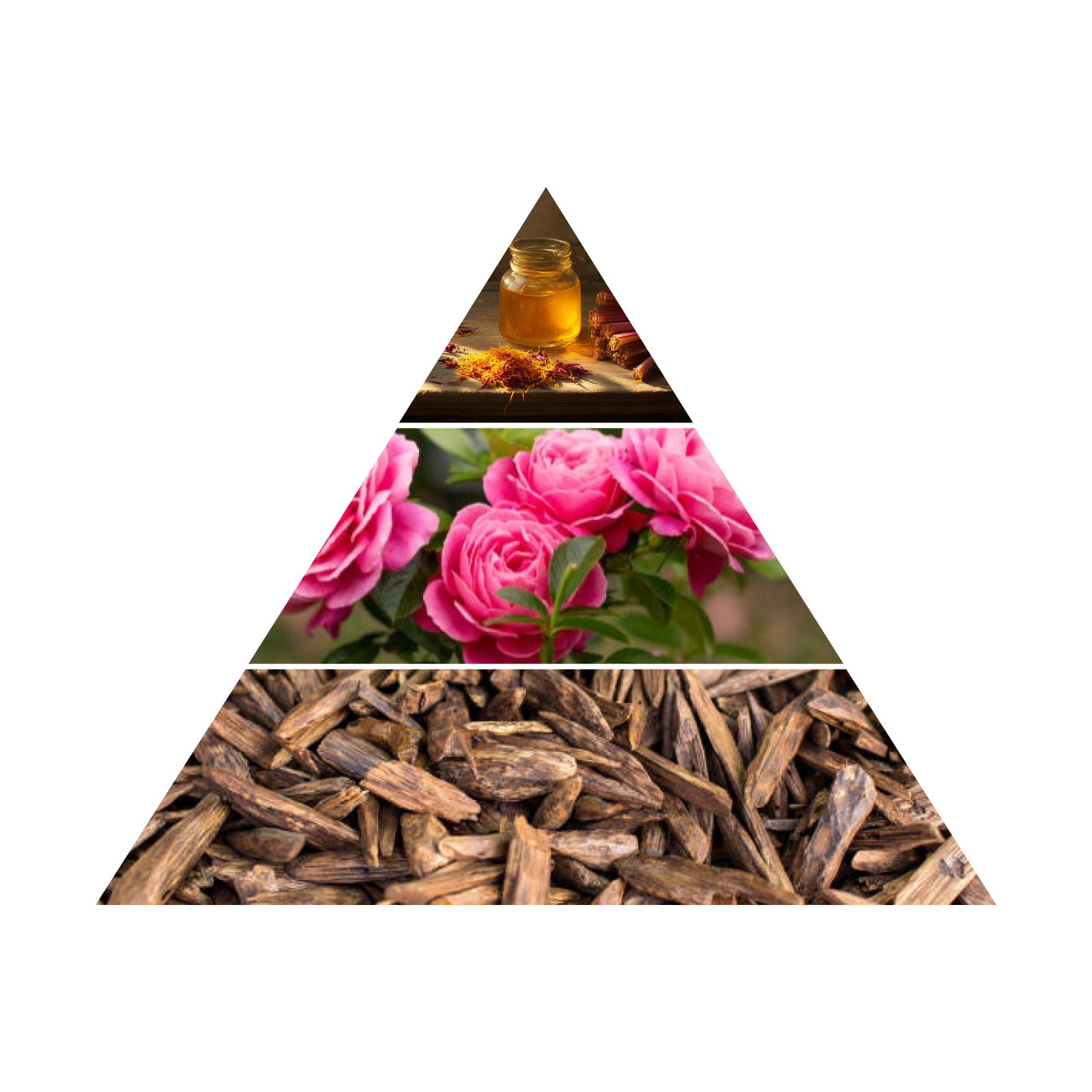 Bustling with opulent ingredients, just like the streets of Times Square at Midnight. The fragrance waltzes in with the spicy, zingy, and sweet notes of saffron, rhubarb, and honey, leaving a refreshing impression on the soul. The floral note encases the heart of the scent with Rose, Praline, and Patchouli. When the heart starts melting, the evasive essence of Amberztreme, Oud Accord, and Vanilla starts to take over the realm.