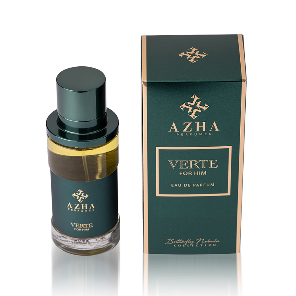 A fragrance of distinction that opens with a crisp blend of cardamom, cypress, and green notes. It evolves into a rich heart of leather, orris, and violet, exuding sophistication. The base notes of ambergris, sandalwood, and vanilla provide a warm and lasting embrace. 'Verte for Him' is a symphony of green freshness, refined leather, and comforting warmth. Elevate your scent game with this timeless essence.